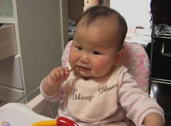 野菜のサイコロ状のものが自分の舌でつぶして食べられるようになったのと、最近ママが食べさせるスプーンを持ちたがるので小さいサイコロ状のかぼちゃを手づかみメニューとして目の前に置いてみました![]()