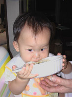 ・・・こんな感じで最近は更に食い意地が張っているようで、汁物はもちろんのことお皿に残ったヨーグルトも飲もうとするし、スプーンについたもののいつまでも舐めています![]()
